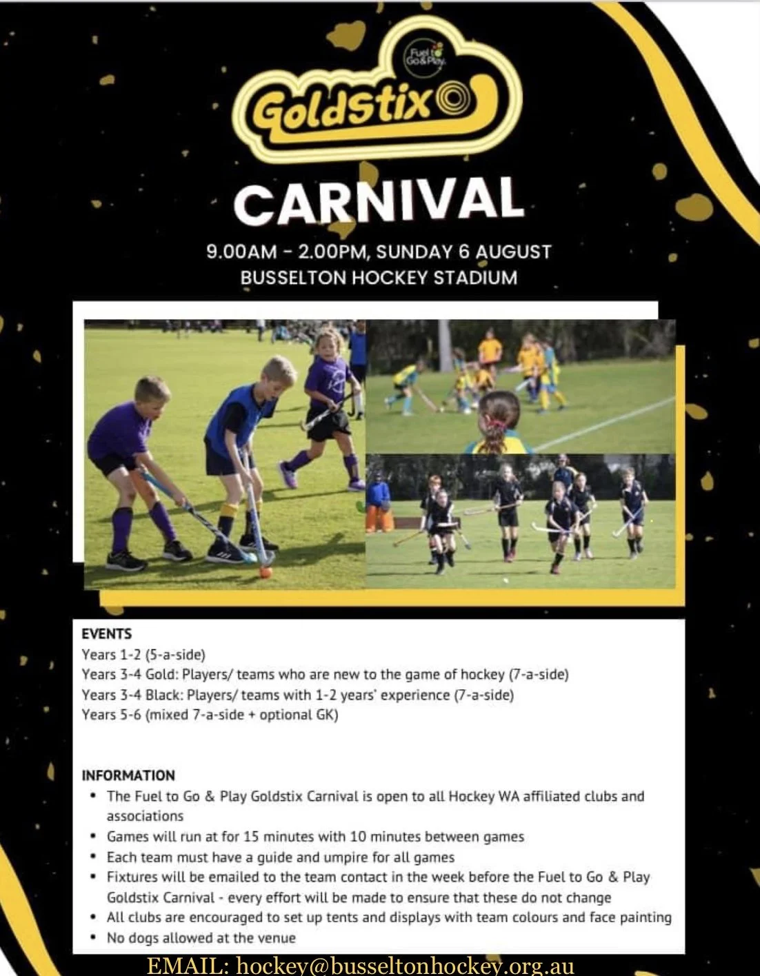 The Goldstix Carnival is a great opportunity for any of our new Goldstix players to join in this popular annual event. It’s also at the Busselton Stadium so you can be part of a carnival atmosphere without the travel to Bunbury!